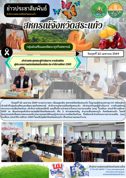 วันพุธที่ 22 เมษายน 2569 นางสาววาสนา เนียมสูงเนิน สหกรณ์จังหวัดสระแก้ว ในฐานะผู้ช่วยเลขานุการฯ พร้อมด้วยเจ้าหน้าที่กลุ่มส่งเสริมและพัฒนาธุรกิจสหกรณ์ สำนักงานสหกรณ์จังหวัดสระแก้ว เข้าร่วมประชุมผู้ดำเนินการ การรับสมัครผู้ประกอบการผลิตภัณฑ์นม เข้ารับการจัดสรรสิทธิ และพื้นที่การจำหน่ายโครงการอาหารเสริม (นม) โรงเรียน ประจำปีการศึกษา 2569 ณ ห้องประชุมสำนักงานปศุสัตว์จังหวัดสระแก้ว ชั้น 2 ตำบลสระขวัญ อำเภอเมืองสระแก้ว จังหวัดสระแก้ว โดยมีวัตถุประสงค์เพื่อตรวจสอบและพิจารณาคุณสมบัติของผู้ประกอบการผลิตภัณฑ์นม ที่สมัครเข้าร่วมโครงการอาหารเสริม (นม) โรงเรียน ประจำปีการศึกษา 2569 โดยมีปศุสัตว์จังหวัดสระแก้ว เป็นประธานคณะทำงาน