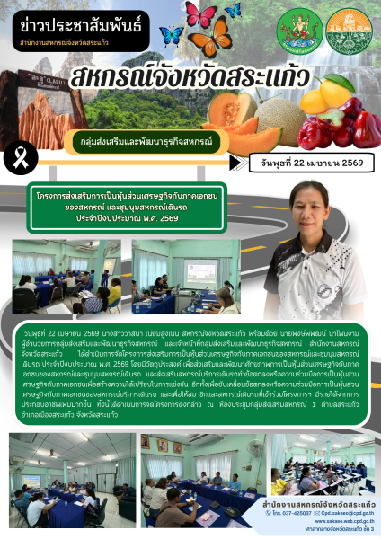 วันพุธที่ 22 เมษายน 2569 นางสาววาสนา เนียมสูงเนิน สหกรณ์จังหวัดสระแก้ว พร้อมด้วย นายพงษ์พิพัฒน์ นาโพนงาม ผู้อำนวยการกลุ่มส่งเสริมและพัฒนาธุรกิจสหกรณ์ และเจ้าหน้าที่กลุ่มส่งเสริมและพัฒนาธุรกิจสหกรณ์ สำนักงานสหกรณ์จังหวัดสระแก้ว ได้ดำเนินการจัดโครงการส่งเสริมการเป็นหุ้นส่วนเศรษฐกิจกับภาคเอกชนของสหกรณ์และชุมนุมสหกรณ์เดินรถ ประจำปีงบประมาณ พ.ศ. 2569