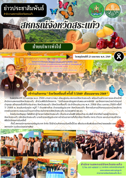 วันพฤหัสบดีที่ 23 เมษายน พ.ศ. 2569 นางสาววาสนา เนียมสูงเนิน พร้อมด้วยข้าราชการและเจ้าหน้าที่สำนักงานสหกรณ์จังหวัดสระแก้ว เข้าร่วมพิธีเปิดโครงการ “ปกป้องและเชิดชูสถาบันพระมหากษัตริย์ และโครงการหน่วยบำบัดทุกข์ บำรุงสุข สร้างรอยยิ้มให้กับประชาชน จังหวัดสระแก้ว (จังหวัดเคลื่อนที่) ประจำปีงบประมาณ พ.ศ. 2569 เดือน เมษายน 2569 ครั้งที่ 7/ 2569 ณ สวนอินทร์นฤมิต หมู่ที่ 7 ตำบลฟากห้วย อำเภออรัญประเทศ จังหวัดสระแก้ว ซึ่งภายในงานมีกิจกรรมและหน่วยบริการจากส่วนราชการ ชมรมแม่บ้านมหาดไทย เหล่ากาชาดจังหวัดสระแก้ว หน่วยแพทย์ พอ.สว.