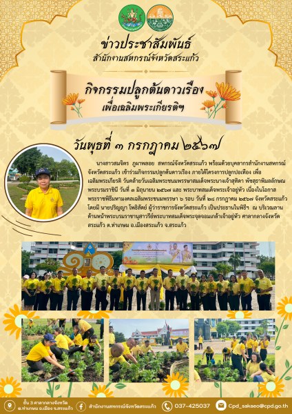 วันพุธที่ ๓ กรกฎาคม ๒๕๖๗ นางสาวสมจิตร ภูผาพลอย สหกรณ์จังหวัดสระแก้ว พร้อมด้วยบุคลากรสำนักงานสหกรณ์จังหวัดสระแก้ว เข้าร่วมกิจกรรมปลูกต้นดาวเรือง ภายใต้โครงการปลูกปอเทือง เพื่อเฉลิมพระเกียรติวันคล้ายวันเฉลิมพระชนมพรรษาสมเด็จพระนางเจ้าสุทิดา พัชสุธาพิมลลักษณ พระบรมราชินี วันที่ ๓ มิถุนายน ๒๕๖๗ และ พระบาทสมเด็จพระเจ้าอยู่หัว เนื่องในโอกาสพระราชพิธีมหามงคลเฉลิมพระชนมพรรษา ๖ รอบ วันที่ ๒๘ กรกฎาคม ๒๕๖๗ จังหวัดสระแก้ว โดยมี นายปริญญา โพธิสัตย์ ผู้ว่าราชการจังหวัดสระแก้ว เป็นประธานในพิธีฯ ณ บริเวณลานด้านหน้าพระบรมราชานุสาวรีย์พระบาทสมเด็จพระจุลจอมเกล้าเจ้าอยู่หัว ศาลากลางจังหวัดสระแก้ว ต.ท่าเกษม อ.เมืองสระแก้ว จ.สระแก้ว