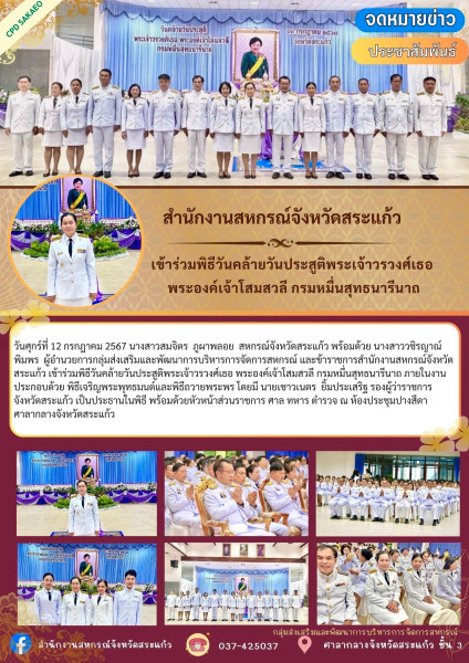 วันศุกร์ที่ 12 กรกฎาคม 2567 นางสาวสมจิตร ภูผาพลอย สหกรณ์จังหวัดสระแก้ว พร้อมด้วยนางสาววชิรญาณ์ พิมพร ผู้อำนวยการกลุ่มส่งเสริมและพัฒนาการบริหารการจัดการสหกรณ์และข้าราชการสำนักงานสหกรณ์จังหวัดสระแก้ว เข้าร่วมพิธีวันคล้ายวันประสูติพระเจ้าวรวงศ์เธอ พระองค์เจ้าโสมสวลี กรมหมื่นสุทธนารีนาถ ภายในงานประกอบด้วยพิธีเจริญพระพุทธมนต์และพิธีถวายพระพร โดยมี นายเชาวเนตร ยิ้มประเสริฐ รองผู้ว่าราชการจังหวัดสระแก้ว เป็นประธานในพิธี พร้อมด้วยหัวหน้าส่วนราชการ ศาล ทหาร ตำรวจ ณ ห้องประชุมปางสีดา ศาลากลางจังหวัดสระแก้ว